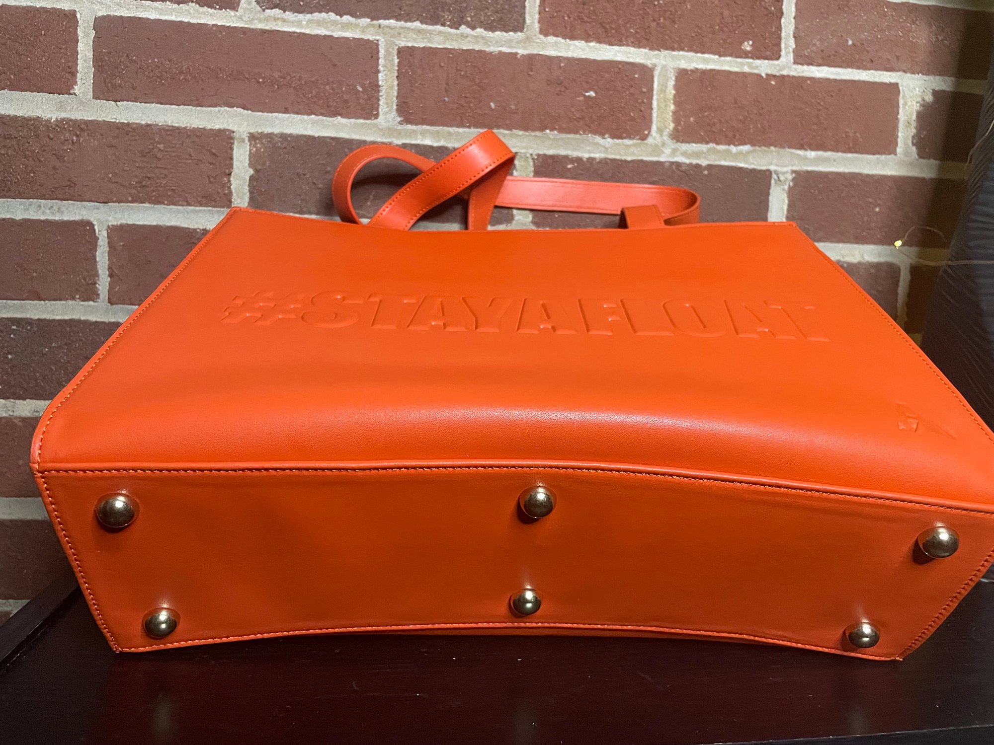 Orange vegan leather tote bag. Comes with an adjustable removable crossbody strap. The bag size is 15x6x11. On the inside there is a zipper pocket on one side and two slot pockets on the other side. Orange vegan leather trim detail on the edge of the slot pockets. Dark brown lining on the inside. Magnetic button closure. Four feet for the bottom of the bag. All hardware is the color gold.